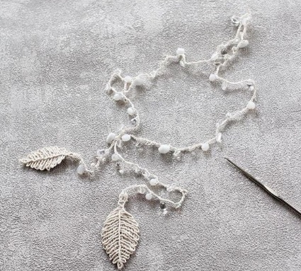 最初にちょっとだけ編んでみて長さを測り、ビーズの全個数からして鎖編み5目→ビーズ1個 としましたが、もっとビーズを入れればよかった。