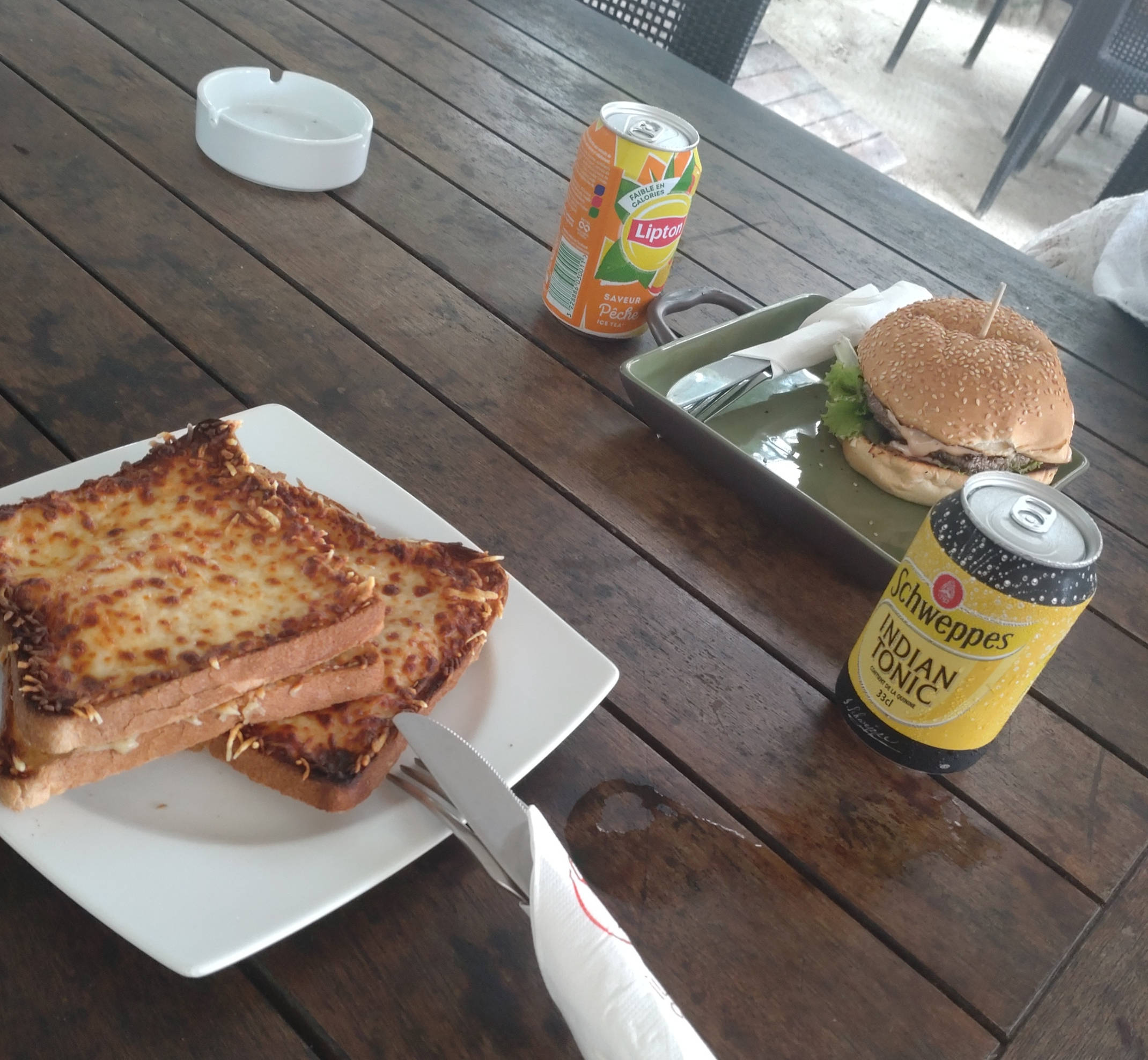 昼食は島のレストランで、私はクロックムッシュ、娘はハンバーガー。